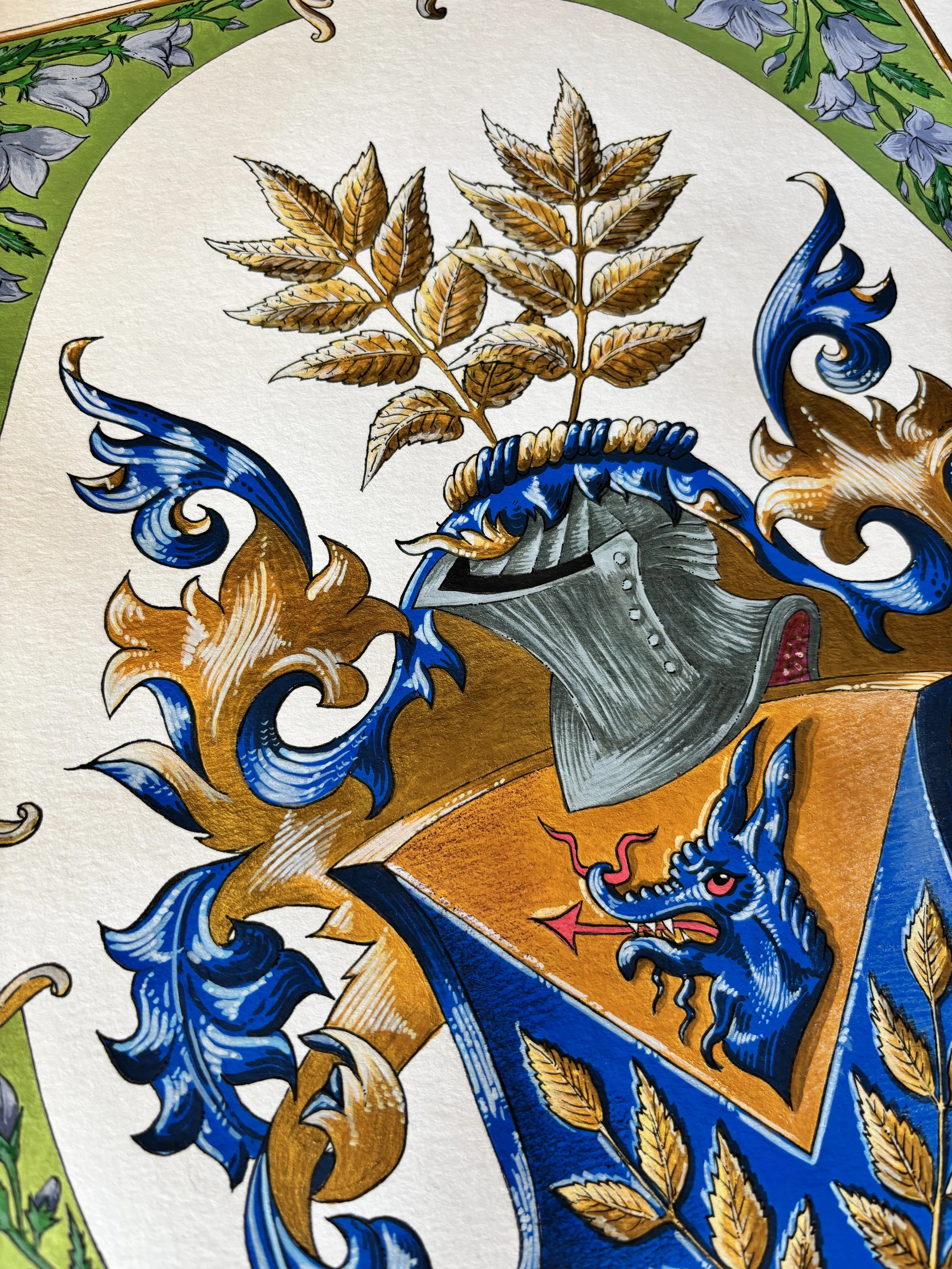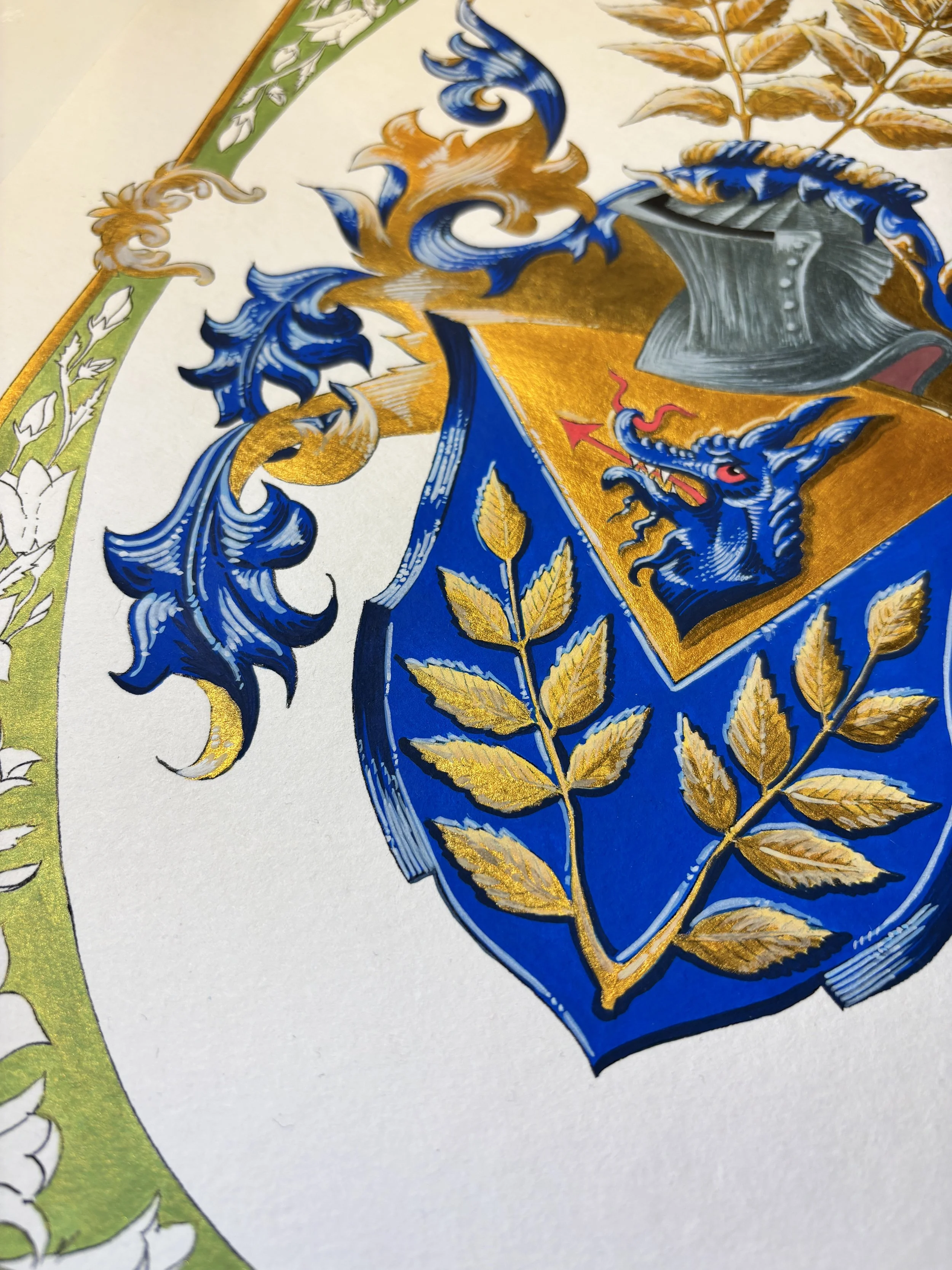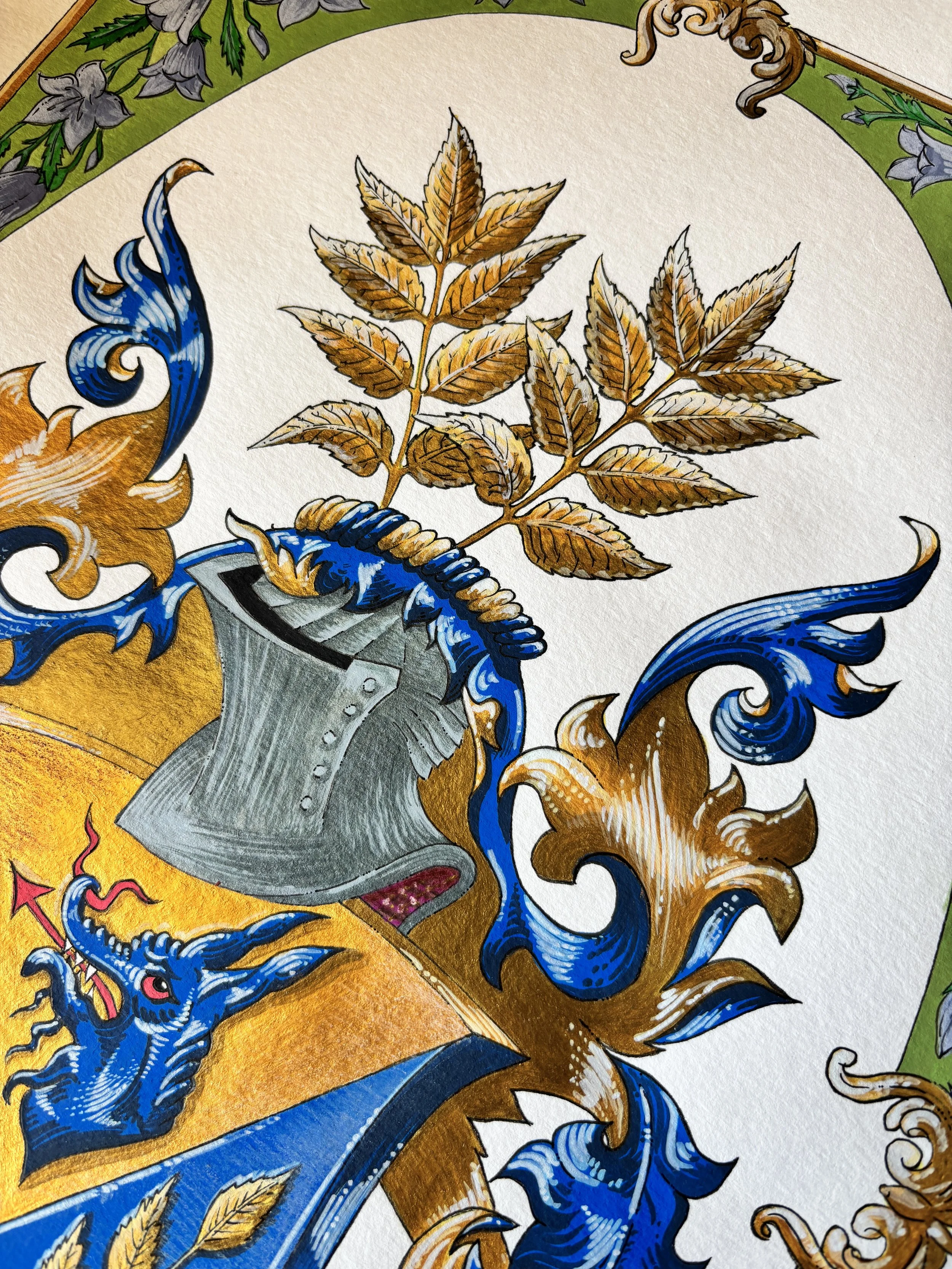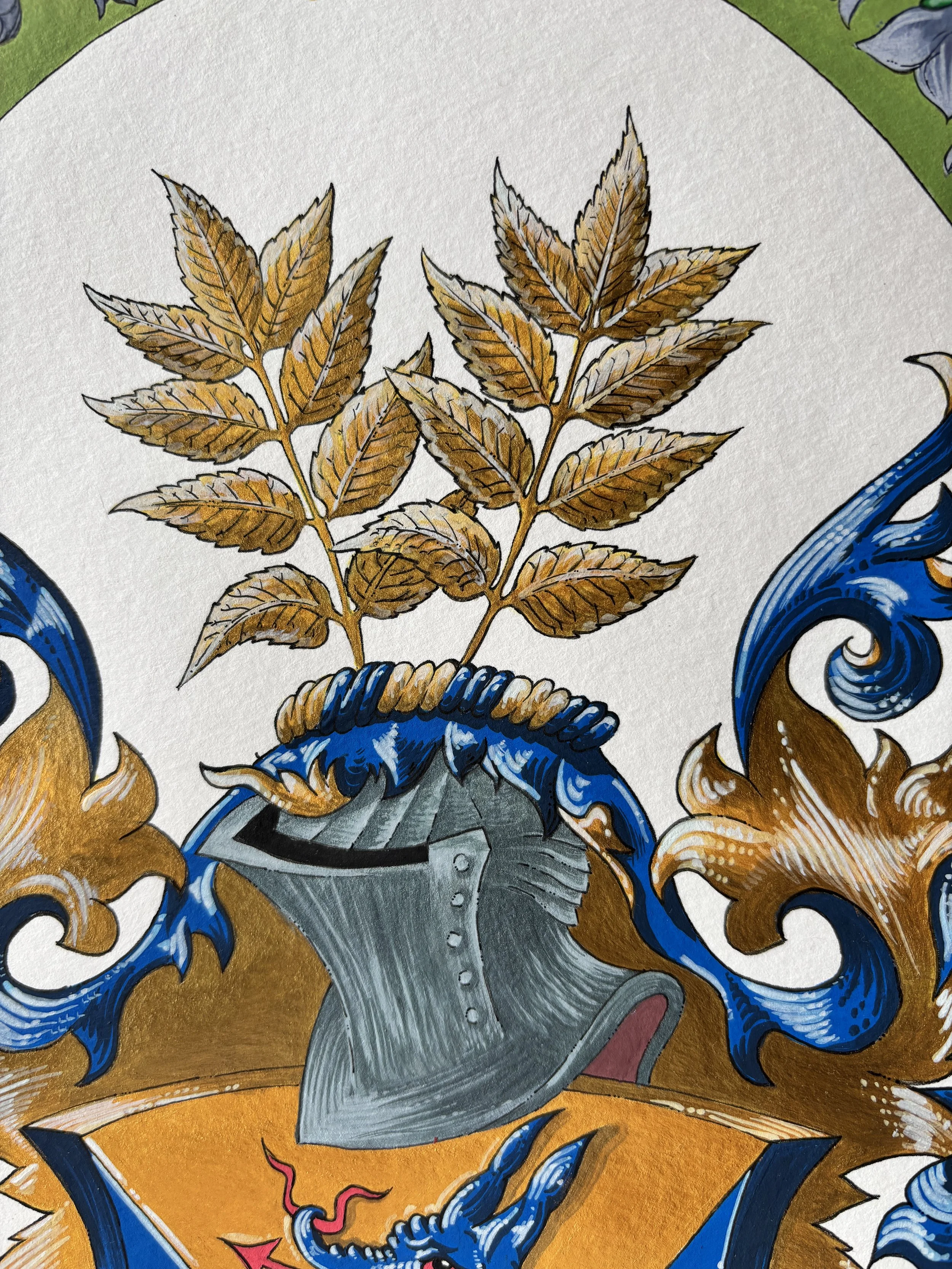 Pictura a fost realizată în guașă și acrilice pe hârtie format A3, păstrând fidelitatea față de elementele heraldice originale, dar redându-le într-un stil personal, cu o cromatică și un nivel de detaliu propriu. Pentru prima dată în cadrul atelierului nostru, am adăugat o bordură decorativă — un gest artistic ce reflectă atât respectul față de tradiție, cât și o dorință de explorare creativă.